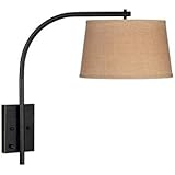 From Kenroy, this contemporary swing arm has an understated design with a dynamic reach. It comes in a rich oil rubbed bronze finish paired with a butterscotch tapered drum shade. An ideal reading or task light. Oil rubbed bronze finish. Butterscotch tapered drum shade. Takes one 150 watt 3-way bulb (not included). Can be hardwired or plugged in. 23" high. 13" wide. Extends 24" from the wall. Shade is 13" wide. Backplate is 7" high, 5" wide.